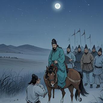 葛万察觉到危险,连夜逃走,独自一人在荒野中奔波。就在他走投无路时,忽然看见一位身着青袍的大人骑着高马迎面而来,身后还跟着十余位随从。大人威严而气宇轩昂,葛万急忙跪拜在路旁。青袍大人微笑着问:“魏胜正在追捕你吧?不用害怕,跟我走。”葛万无计可施,只能跟随大人步行。
